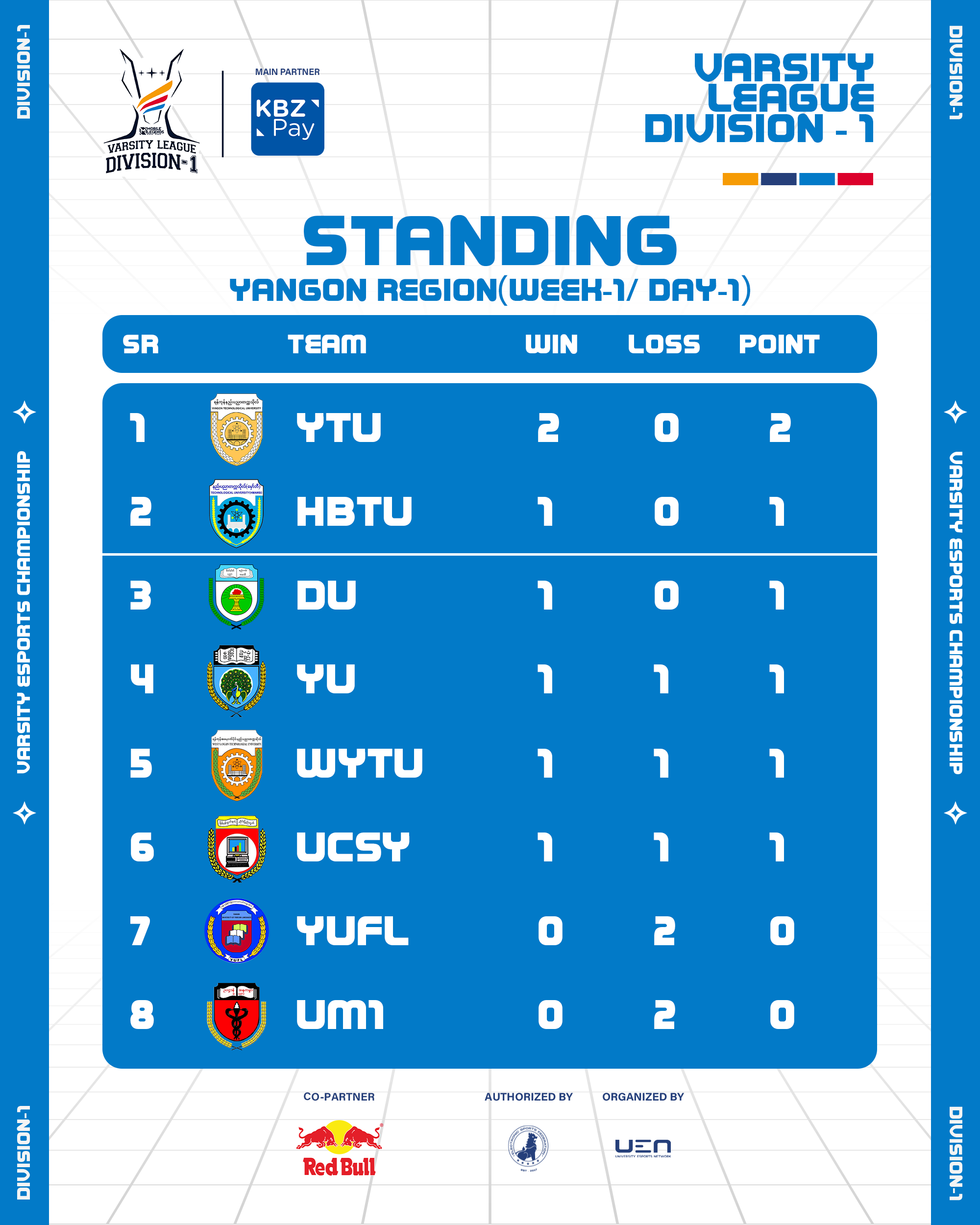 အခုဆိုရင် Varsity League Division 1 - Yangon Region ရဲ့ ပထမနေ့ပွဲစဥ်များဟာ ပြီးဆုံးလိုသွားခဲ့ပါပြီ။