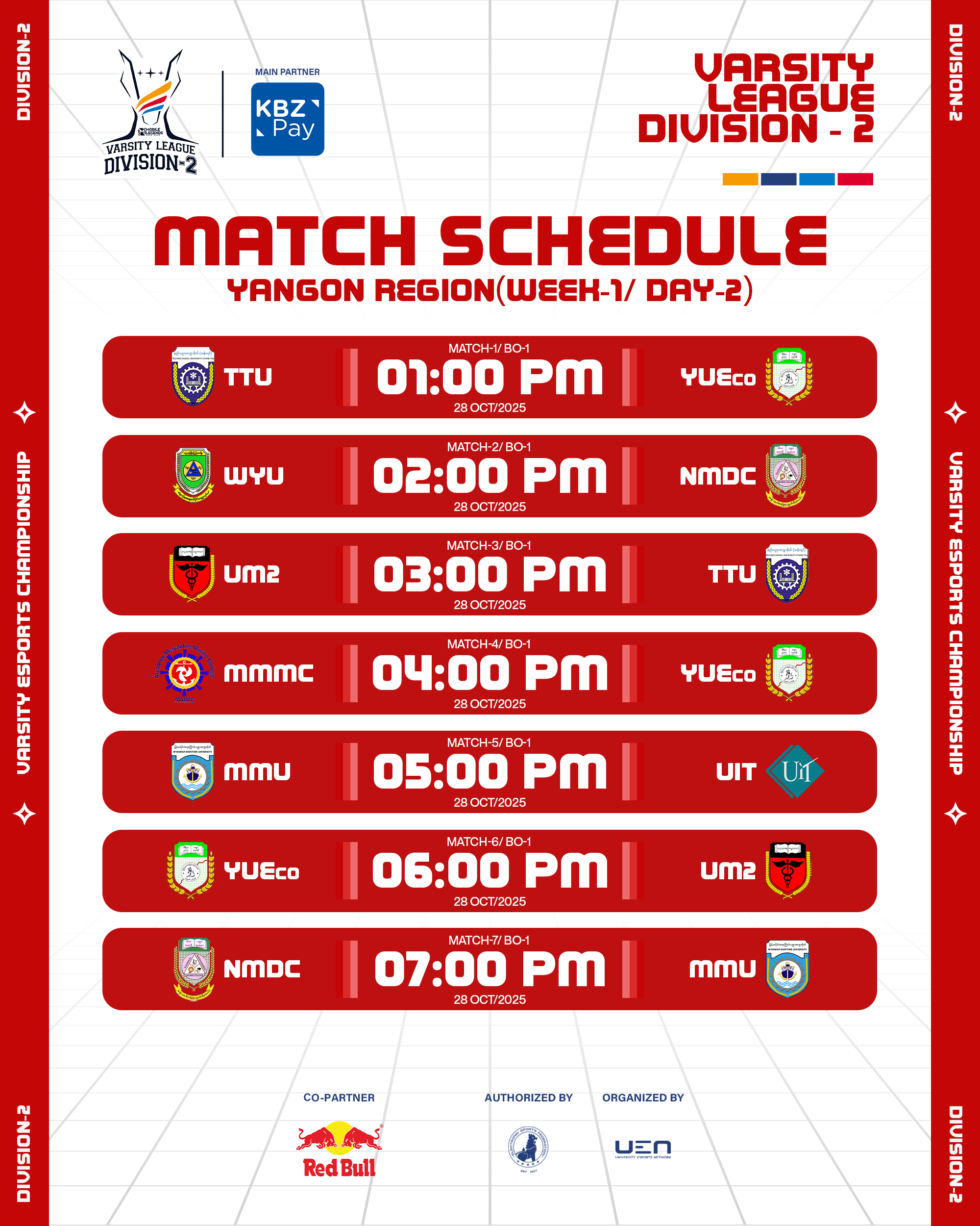 Tomorrow (October 28th) we will be broadcasting the second day of Varsity League Division - Yangon Region matches live.